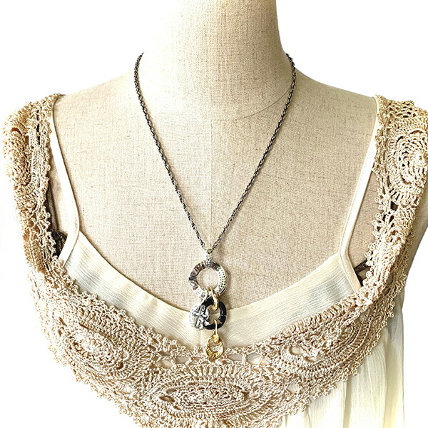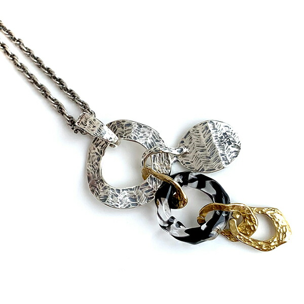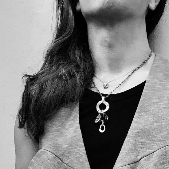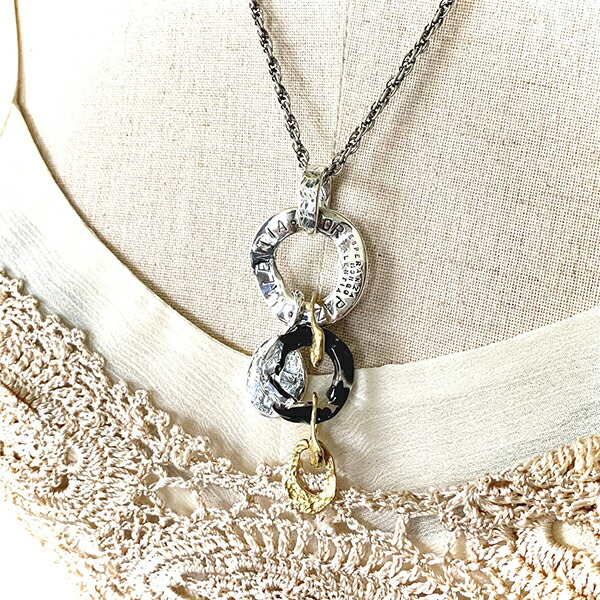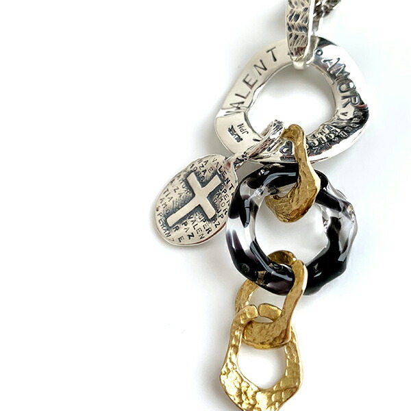 シンプルなオリジナルパーツの組み合わせで、存在感を引き出したデザインペンダント。それぞれのパーツが独立していて、全てに動きが出る。打ち込まれた文字はスペイン語で愛、勇気、希望、平和の文字で、新しい状態で綺麗に手入れをしながら重厚なシルバーの光を楽しんでも良いし、そのまま使い古した雰囲気になっても落ち着いたまとまりに時間と共になる事を考えて作られた、愛用者の好みで先々の雰囲気が変わる楽しみがあるペンダント。連結されたオリジナルパーツはメンテナスを計算された構造になっている。