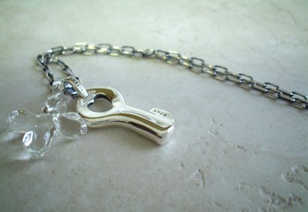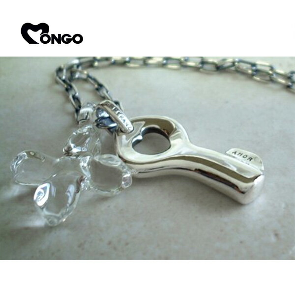 ハートのくり貫きを施した、ナチュラルでシャープなキーデザインのペンダントTOPに、MONGO017品番同様のLeafガラスを合わせたペンダント。TOPのキーはシャープながらボリュームと重量があり、本体にはスペイン語で愛、バチカンに勇気、希望・・この文字を入れている。Leafガラスは、見る人によって、クロスにも、四葉にも見えるラッキーデザイン。シンプルでありながら、存在感を強く出したペンダントです。