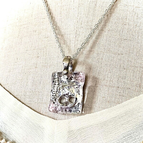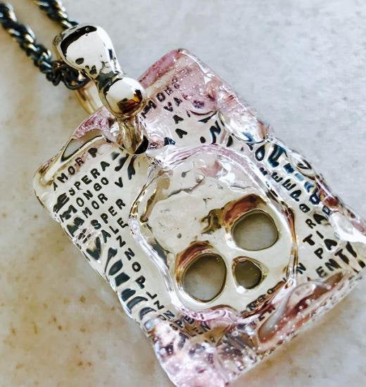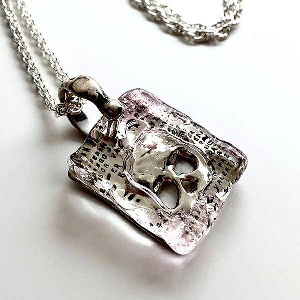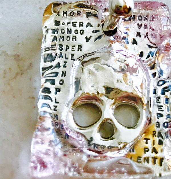スペイン語で、愛、勇気、希望、平和の文字刻印が打ち込まれ、中央にスカル顔が彫られたシルバープレートに、肉厚なガラスを合わせてガラス越しに見える文字の歪みが不思議な世界を醸し出すペンダント。またスカルの輪郭はガラスの陥没で形成され、よりクリスタル感を出しています。ガラスとシルバープレートに動きがあり、ゆれた時の音色が美しい。1点着けでクリスタル感と絶大な存在感があります。
