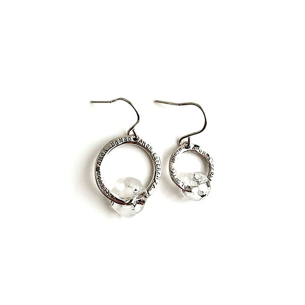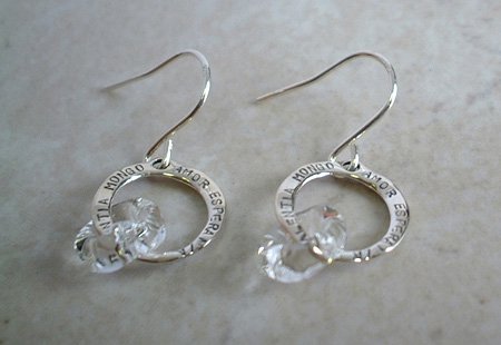 スペイン語で、愛、勇気、希望、平和の刻印文字が入ったリングに、ハンドメイドガラスリングを絡めた揺れるピアス。このデザインは、リングの大小と2つの商品が御座いますが、こちらは小さい方のピアスになります。