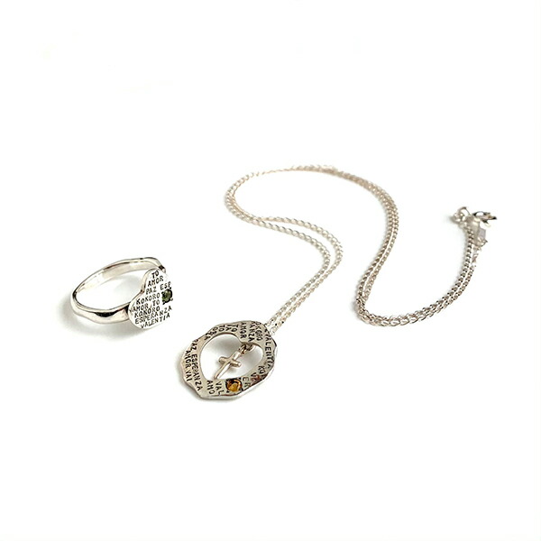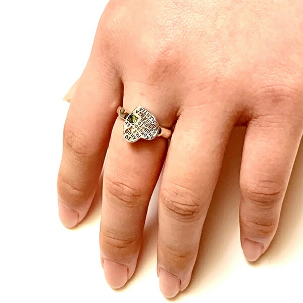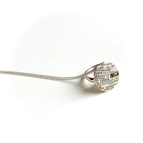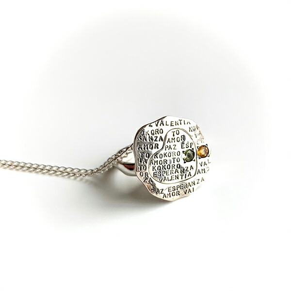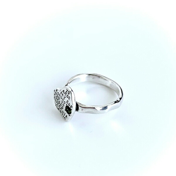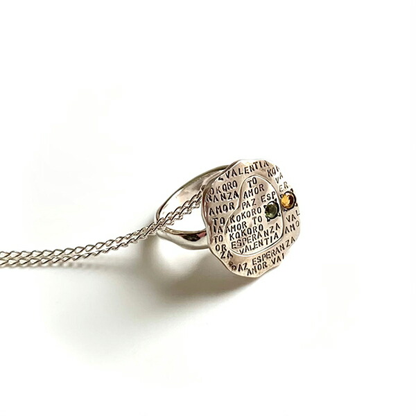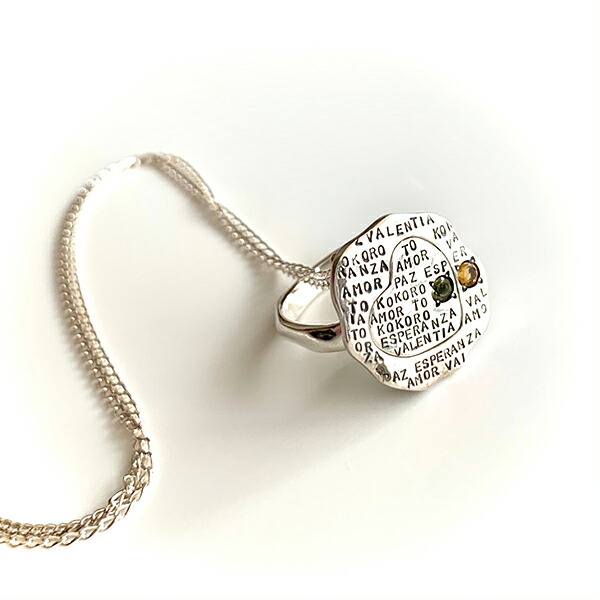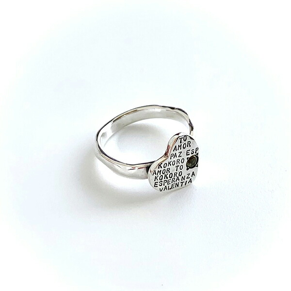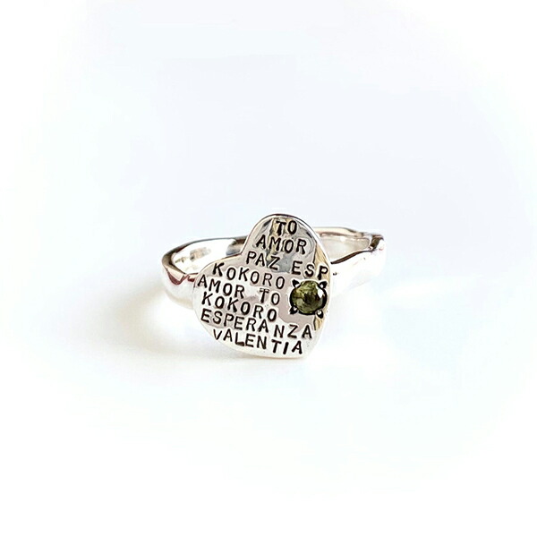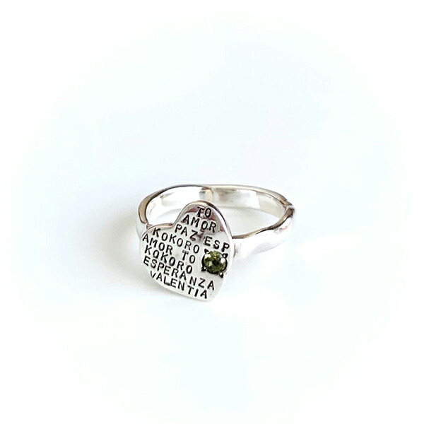 心の絆をテーマにした、ハートモチーフのリング。スペイン語で愛・勇気・希望・平和の文字の中に“心と心”の文字を隠し入れ、天然石のペリドットが入ったデザイン。