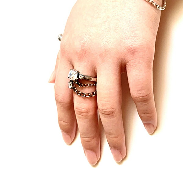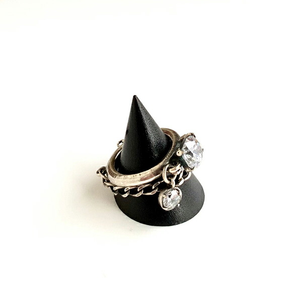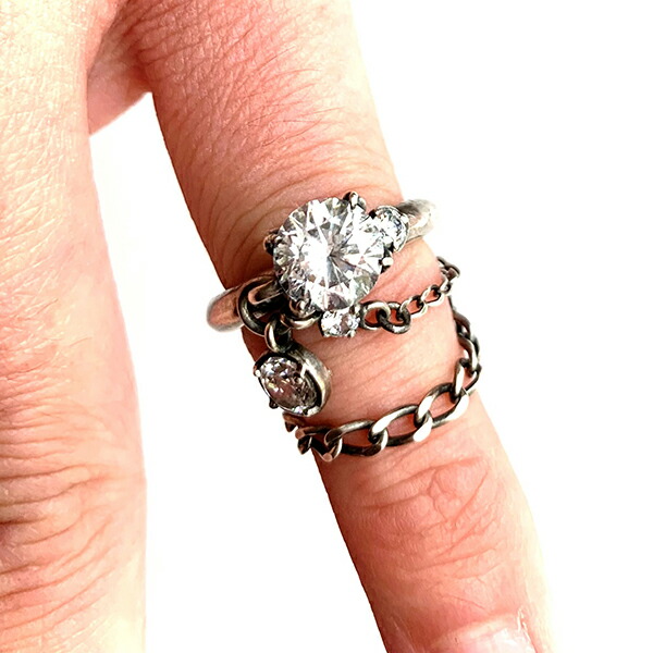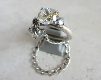 大振りジルコニアの入ったシルバーのダメージリングに、2種類のドレープチェーンを垂らしたリングになります。