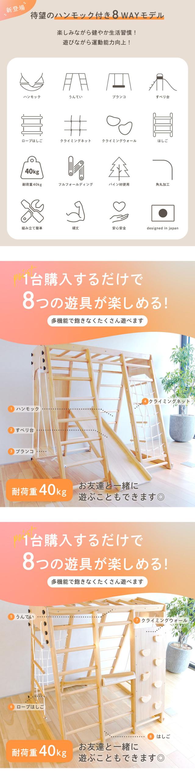 ジャングルジム 8Way ハンモック付 すべり台 室内ジャングルジム 木製 天然木 吊り輪 ブランコ 滑り台 クライミングネット アスレチック ハンモック 運動 室内遊具 大型遊具 家庭用 おもちゃ