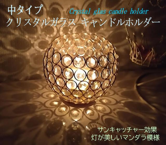 クリスタルガラス キャンドルホルダー 中 12×11cm ゴールドカラー 瞑想 サンキャッチャー効果 灯が美しいマンダラ模様 h065