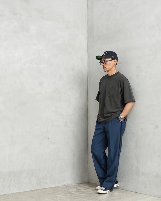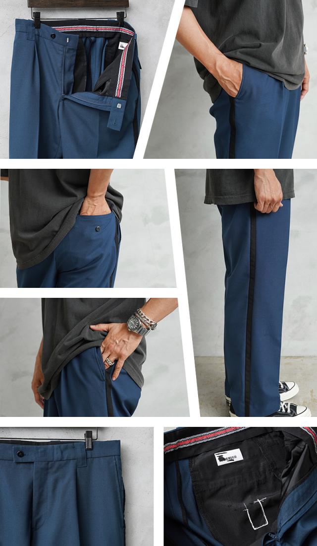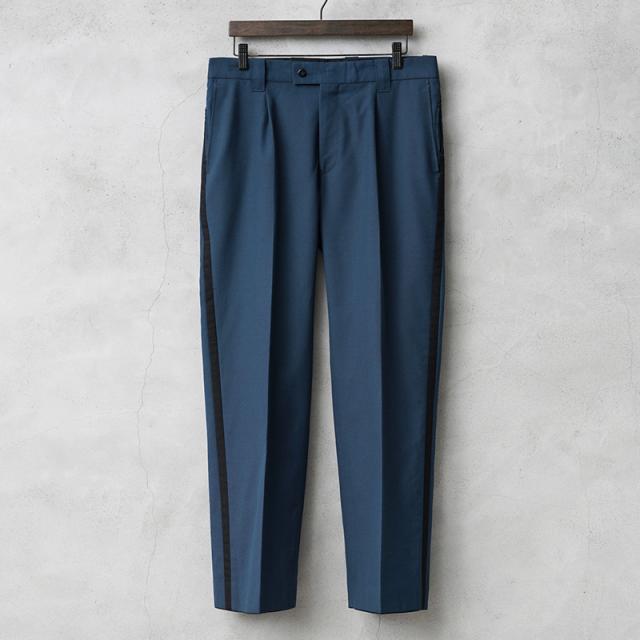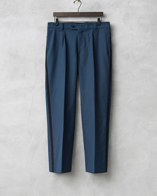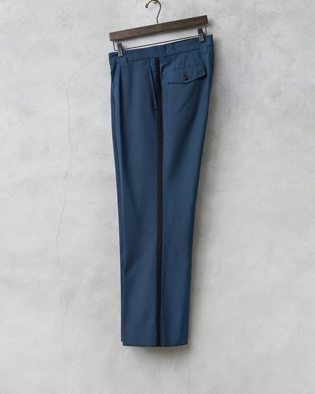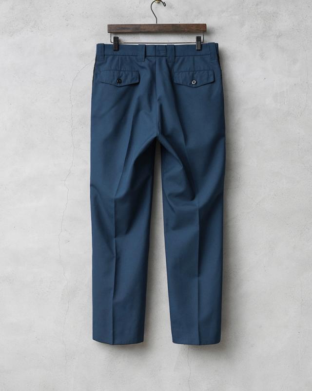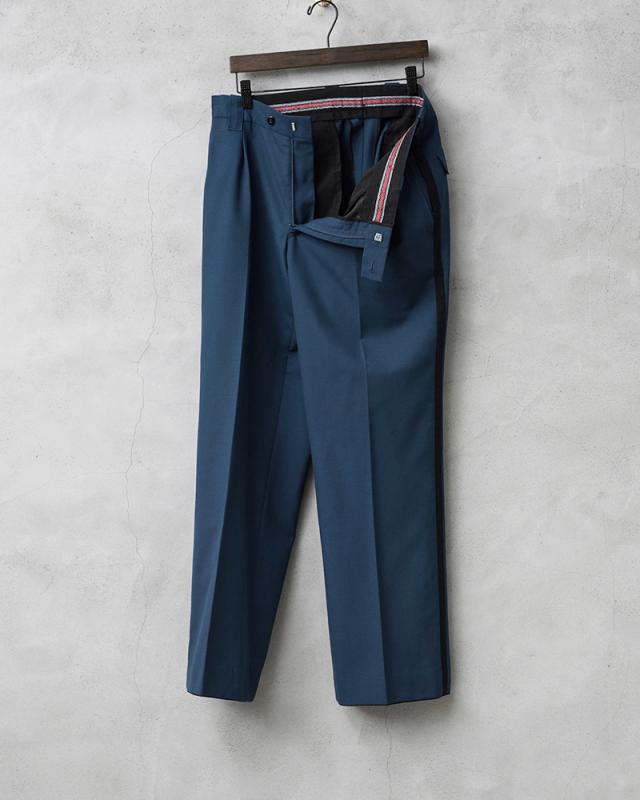 2014年以前にオランダ警察(Nationale Politie)で使用されていた、明るすぎないブルーにさり気なくブラックのサイドラインが入ったデザインのトラウザーズです。フロントはワンタック仕様です。タックを入れることで腰回りにゆとりを持たせることができ、動きやすさを確保してタックインなどのシンプルな着こなしにもアクセントになりおすすめです。肌触りの良いウール、ポリエステルブレンドの生地を使用し、ウール特有のストレスを感じることはなく、フロントは使いやすいジッパーフライ仕様で、ゆったりと穿けるゆるやかなテーパードシルエットです。サイドラインが入れられることで足長効果が期待できるほか、センタークリースが入ることで立体的なフォルムができ、クラシックなスラックスの様な表情で上質な雰囲気を感じさせます。レザーシューズやスニーカーにも愛称が良く使いやすい1本です。現在は製造されていないため、今後は入手が困難になっていくことが予想されるアイテムです。