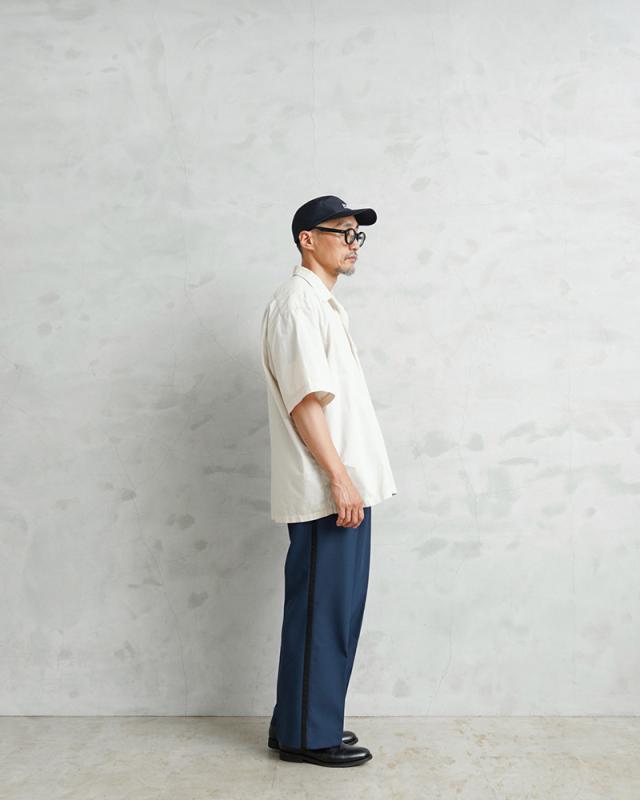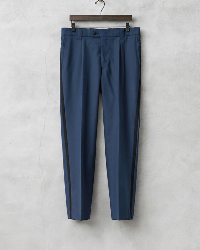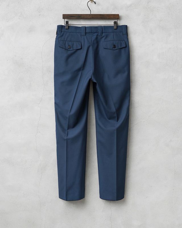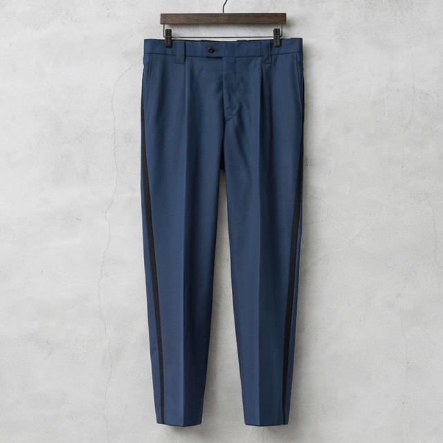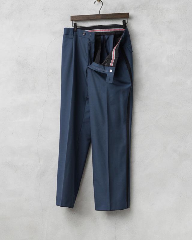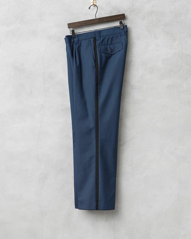 2014年以前にオランダ警察(Nationale Politie)で使用されていた、明るすぎないブルーにさり気なくブラックのサイドラインが入ったデザインのトラウザーズです。フロントはワンタック仕様です。タックを入れることで腰回りにゆとりを持たせることができ、動きやすさを確保してタックインなどのシンプルな着こなしにもアクセントになりおすすめです。肌触りの良いウール、ポリエステルブレンドの生地を使用し、ウール特有のストレスを感じることはなく、フロントは使いやすいジッパーフライ仕様で、ゆったりと穿けるゆるやかなテーパードシルエットです。両サイドのスラッシュポケットとバックポケットはボタン留めのフラップ付きで、それ以外に右ポケットのサイドラインの部分に約10cm程の玉縁ポケットが設けられており、深さが約40cmあり、警棒などを収納するためか、何かしらの装備を収納することを目的としたおもしろいポケットが付属しています。