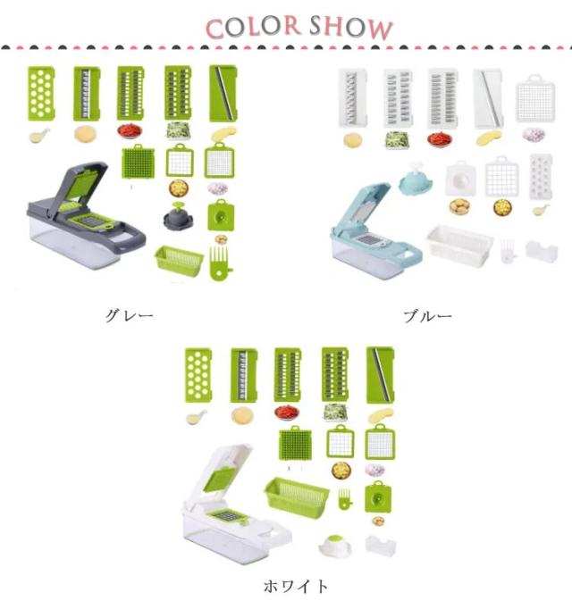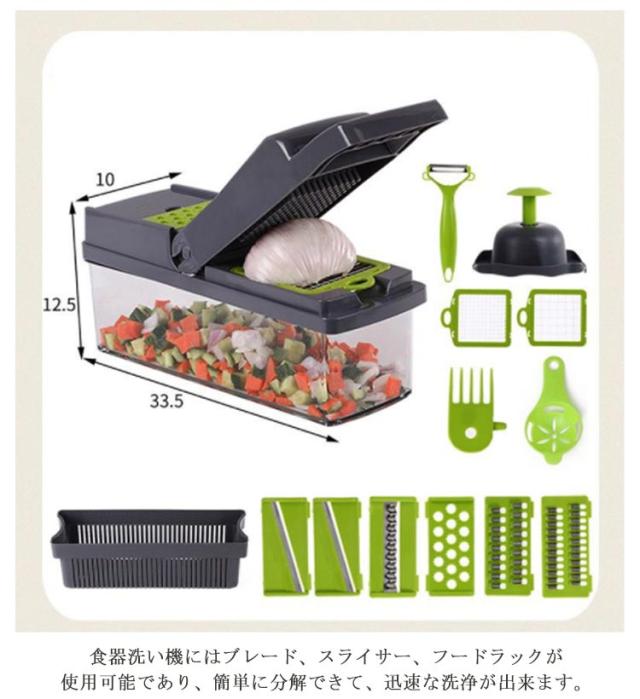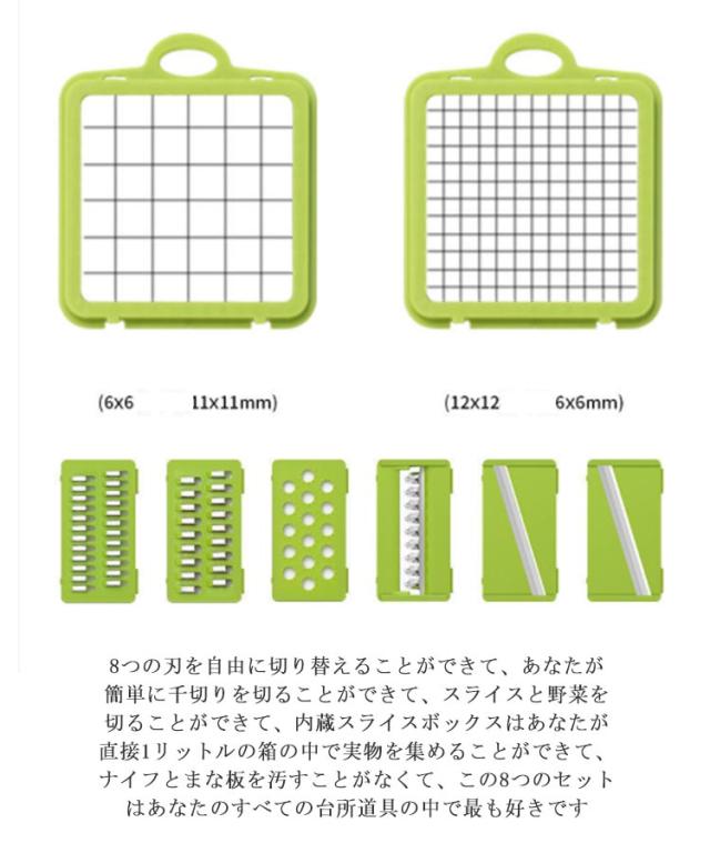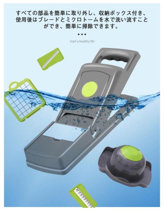 | 8つの刃を自由に切り替えることができて、あなたが簡単に千切りを切ることができて、スライスと野菜を切ることができて、内蔵スライスボックスはあなたが直接1リットルの箱の中で実物を集めることができて、ナイフとまな板を汚すことがなくて、この8つのセットはあなたのすべての台所道具の中で最も好きです 簡単な清潔:すべての部品を簡単に取り外し、収納ボックス付き、使用後はブレードとミクロトームを水で洗い流すことができ、簡単に掃除できます。食器洗い機にはブレード、スライサー、フードラックが使用可能であり、簡単に分解できて、迅速な洗浄が出来ます。刃が鋭いので気をつけてください。 | |
