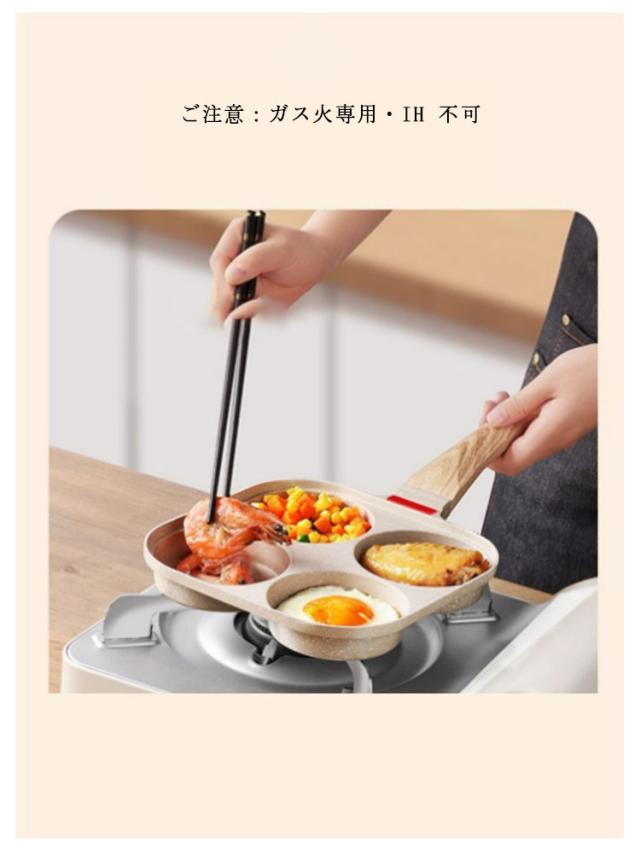 | 様々な調理を同時進行でき時短になるので、忙しい朝にお弁当や朝食作りにとても便利です。 円形仕切りにより、目玉焼き、ソーセージ、パンケーキ、今川焼きなどを綺麗に仕上げます。 鍋の内面は焦げ付き防止コーティングで処理されているため、全体を水洗いでき長期間清潔に使い続けられます。_x000b_調理後もスポンジで軽く拭くだけで、汚れもスルッと落ちます。 オシャレなデザインにより、キッチンを明るく、日々のお調理がより一層楽しくなります。 ご注意:ガス火専用・IH 不可 | |