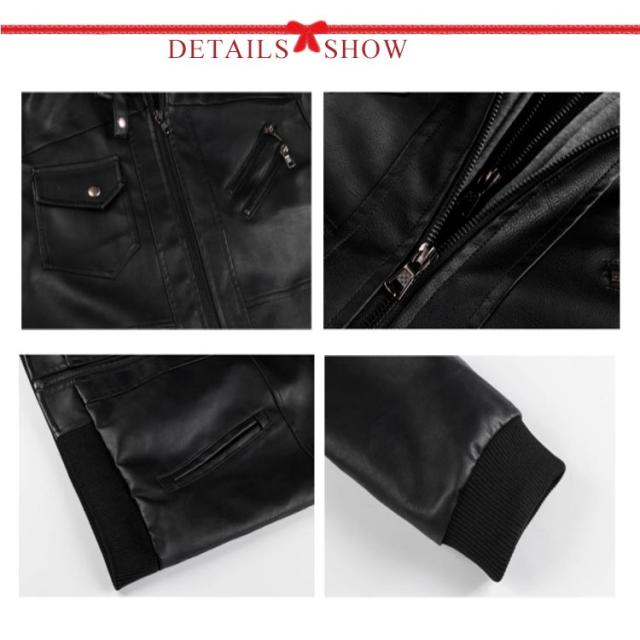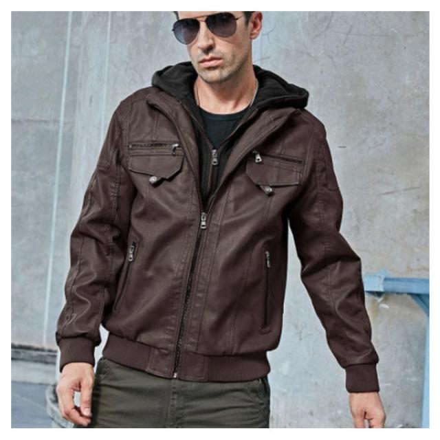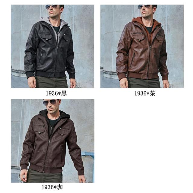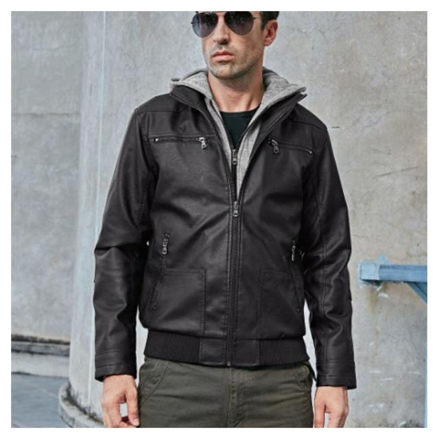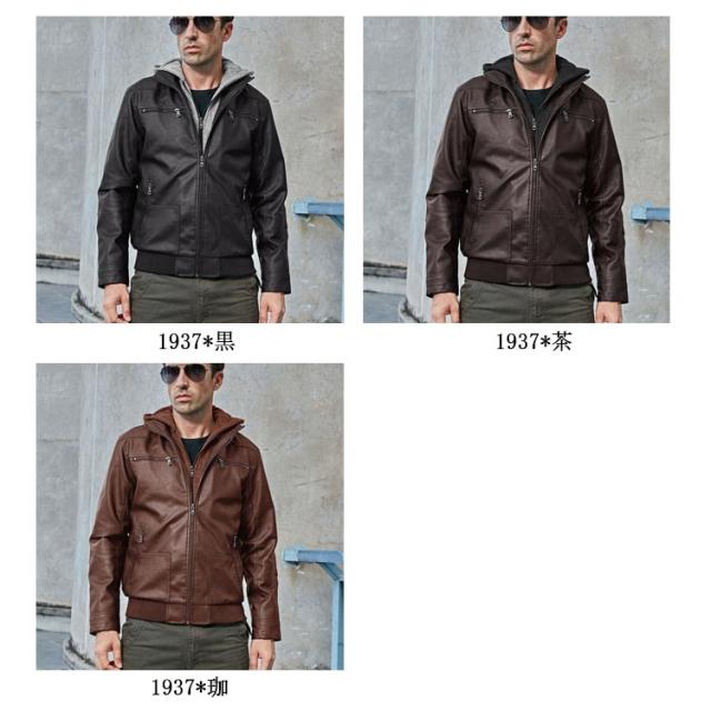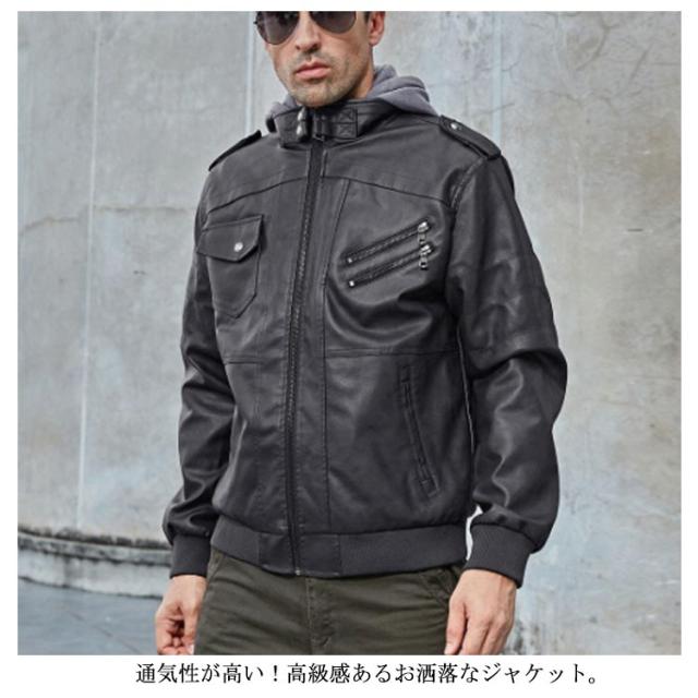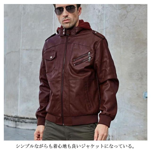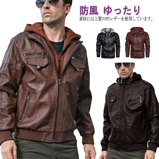 フェイクレイヤード レザージャケット メンズ フード付き カジュアル ライダース 皮ジャン PUレザー ジャンパー ブルゾン フェイクレザージャケット 防風 ゆったり 春 秋 冬 彼氏 立ち襟 アウトドア おしゃれ S M L XL 2XL 3XL