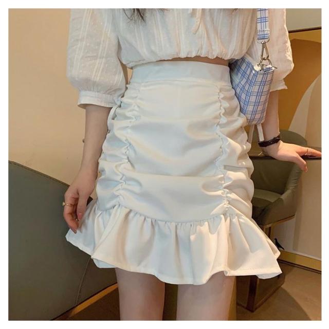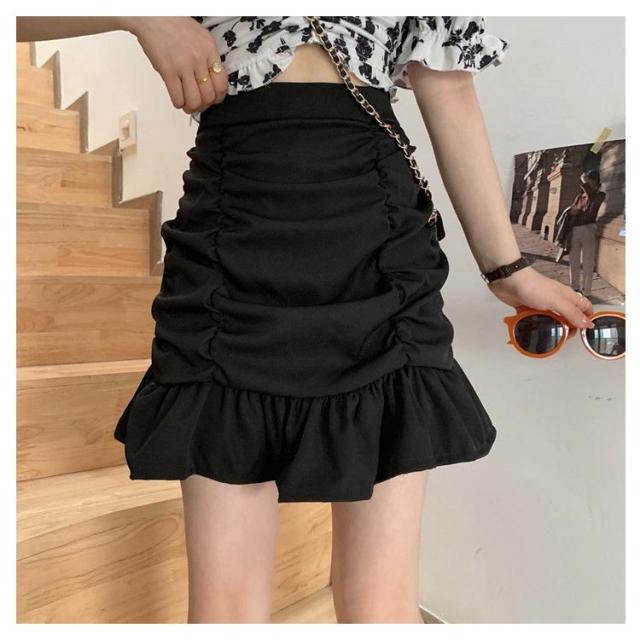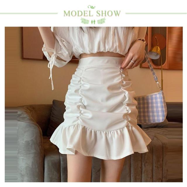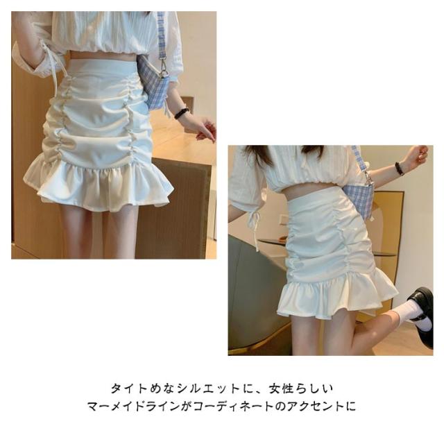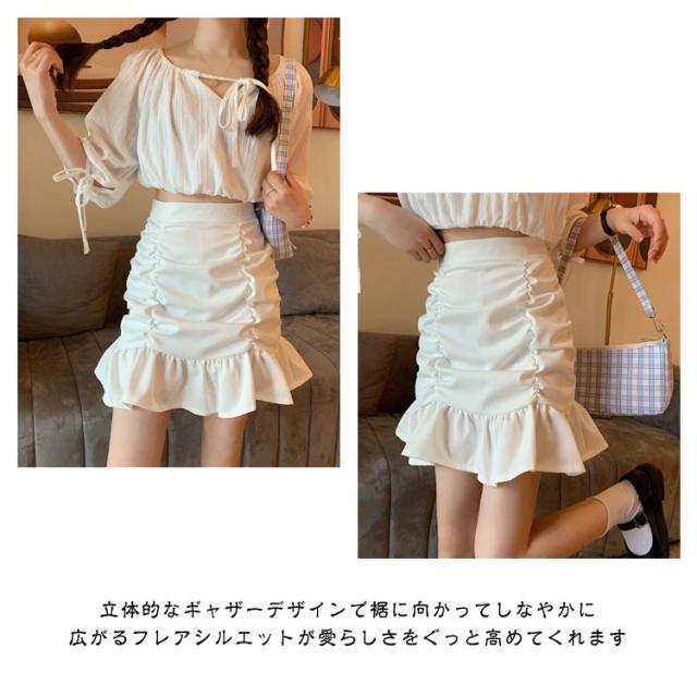 送料無料 マーメイドミニスカート ミニスカ ショートスカート マーメイドスカート フリル ギャザー ウエストゴム ギャザースカート ストレッチ 伸縮 フィッシュテール 無地 ボトムス オフイス フェミニン エレガント