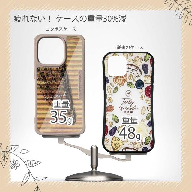 | 注意事項 | コンポスケースは、フレーム部分に「生分解性プラスチック」という環境に優しい素材を使用しております。そのため擦ったり、ぶつけたりする衝撃を与えると脆い部分もあります。耐衝撃ケースではないことをご了承ください。 Qi充電やMagSafe充電にも対応していますが、装着していない時に比べると充電速度は落ちます。 |