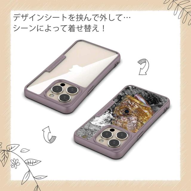 | デザインシートについて | 薄いPET素材にUV印刷を施してプリントします。ケース背面には透明の再生プラスチックが取り付けられているので、その内側にシートを入れ、スマホ本体をハメ込んで使います(背面の再生プラスチックとスマホの間にシートを挟むイメージ)。また、シート自体は着せ替えが可能です(当店にて別途、他のデザインシートを購入可能)。 |