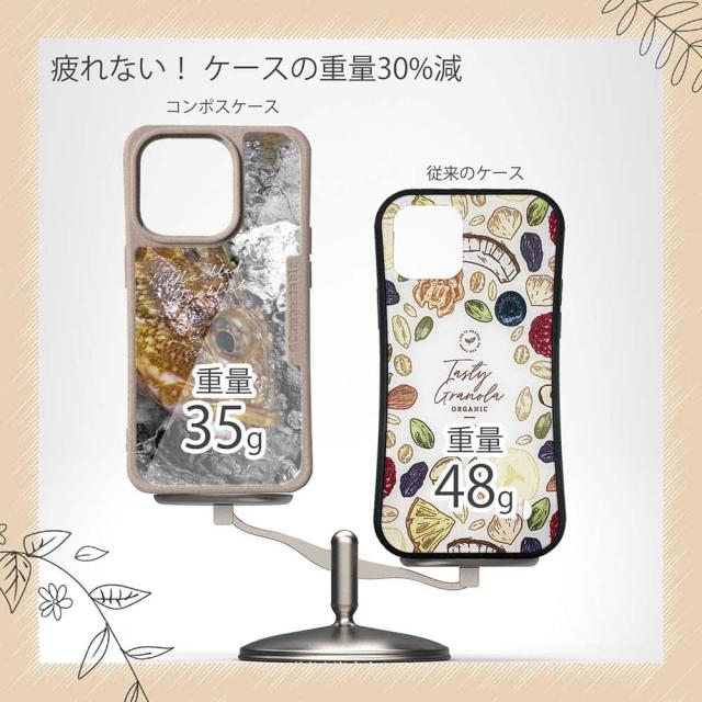 | 注意事項 | コンポスケースは、フレーム部分に「生分解性プラスチック」という環境に優しい素材を使用しております。そのため擦ったり、ぶつけたりする衝撃を与えると脆い部分もあります。耐衝撃ケースではないことをご了承ください。 Qi充電やMagSafe充電にも対応していますが、装着していない時に比べると充電速度は落ちます。 |