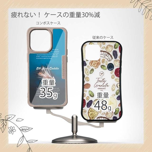 | 注意事項 | コンポスケースは、フレーム部分に「生分解性プラスチック」という環境に優しい素材を使用しております。そのため擦ったり、ぶつけたりする衝撃を与えると脆い部分もあります。耐衝撃ケースではないことをご了承ください。 Qi充電やMagSafe充電にも対応していますが、装着していない時に比べると充電速度は落ちます。 |