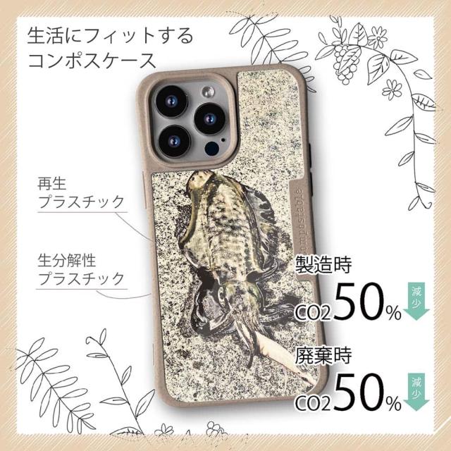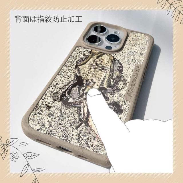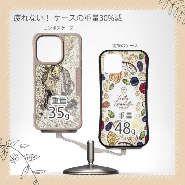 | 注意事項 | コンポスケースは、フレーム部分に「生分解性プラスチック」という環境に優しい素材を使用しております。そのため擦ったり、ぶつけたりする衝撃を与えると脆い部分もあります。耐衝撃ケースではないことをご了承ください。 Qi充電やMagSafe充電にも対応していますが、装着していない時に比べると充電速度は落ちます。 |