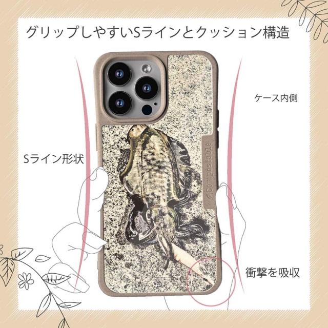 | ケースについて | 背面の内側に入れ込むデザインシートで、シーンに合わせて着せ替え可能。また、グリップしやすいクッション構造で、本体重量は約35gと軽減化を実現。さらにSライン形状で、究極に押しやすいボタン設計(切り込みが入ることで押し込む力を軽減)、背面のカメラ・レンズを保護する高さ設計となっております。生分解性プラスチック素材ながらも着脱もしやすく、割れない・指紋防止加工を施しています。 |