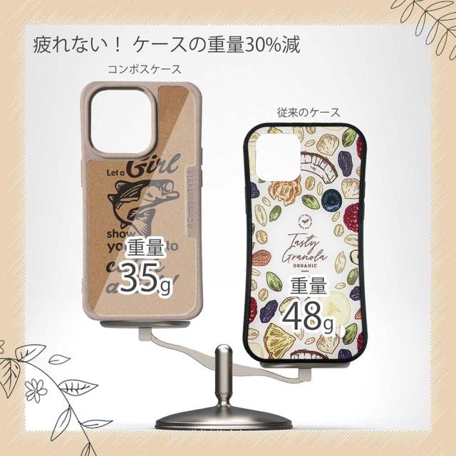 | 注意事項 | コンポスケースは、フレーム部分に「生分解性プラスチック」という環境に優しい素材を使用しております。そのため擦ったり、ぶつけたりする衝撃を与えると脆い部分もあります。耐衝撃ケースではないことをご了承ください。 Qi充電やMagSafe充電にも対応していますが、装着していない時に比べると充電速度は落ちます。 |