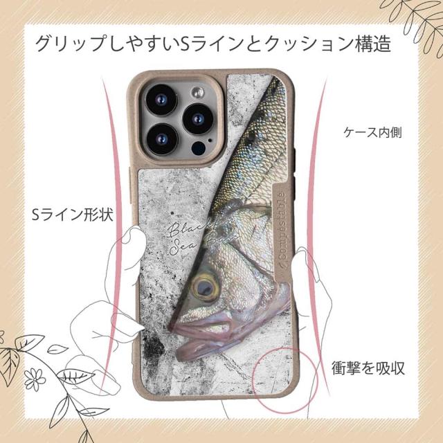 | ケースについて | 背面の内側に入れ込むデザインシートで、シーンに合わせて着せ替え可能。また、グリップしやすいクッション構造で、本体重量は約35gと軽減化を実現。さらにSライン形状で、究極に押しやすいボタン設計(切り込みが入ることで押し込む力を軽減)、背面のカメラ・レンズを保護する高さ設計となっております。生分解性プラスチック素材ながらも着脱もしやすく、割れない・指紋防止加工を施しています。 |