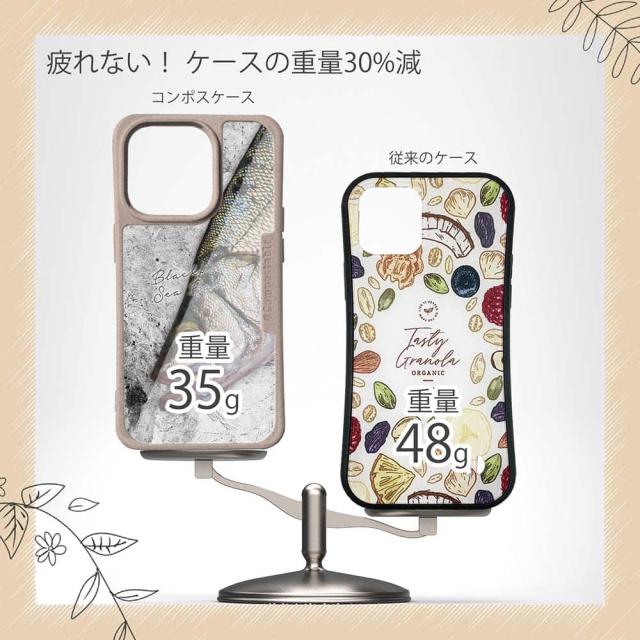 | 注意事項 | コンポスケースは、フレーム部分に「生分解性プラスチック」という環境に優しい素材を使用しております。そのため擦ったり、ぶつけたりする衝撃を与えると脆い部分もあります。耐衝撃ケースではないことをご了承ください。 Qi充電やMagSafe充電にも対応していますが、装着していない時に比べると充電速度は落ちます。 |