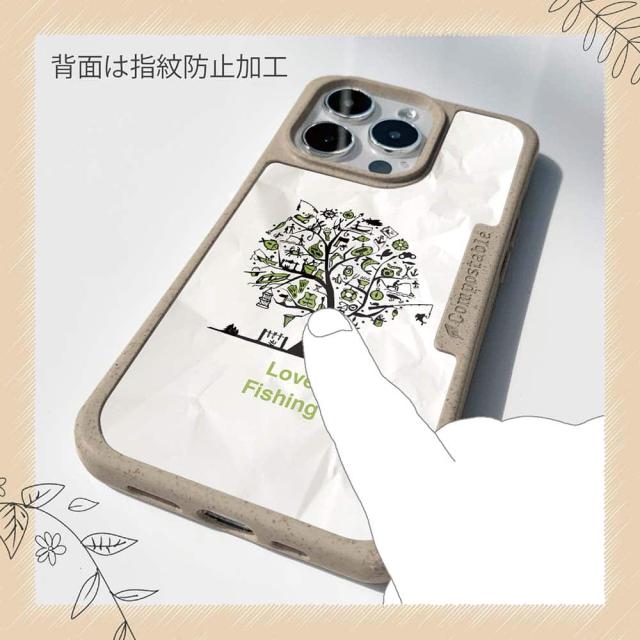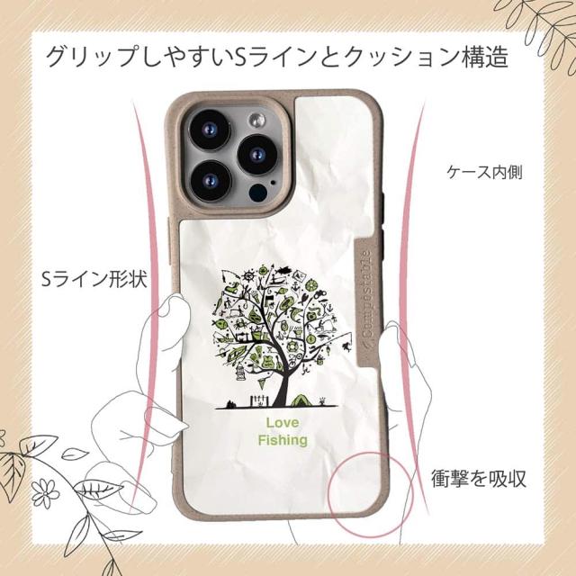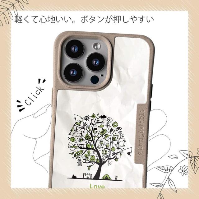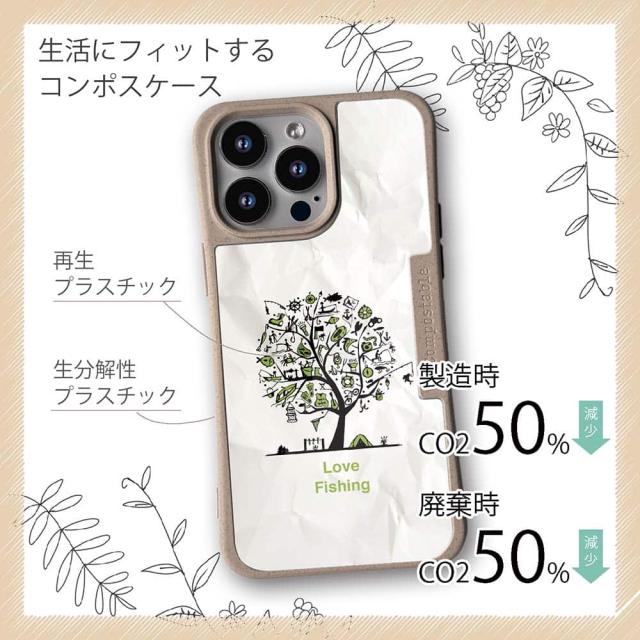 | 注意事項 | コンポスケースは、フレーム部分に「生分解性プラスチック」という環境に優しい素材を使用しております。そのため擦ったり、ぶつけたりする衝撃を与えると脆い部分もあります。耐衝撃ケースではないことをご了承ください。 Qi充電やMagSafe充電にも対応していますが、装着していない時に比べると充電速度は落ちます。 |