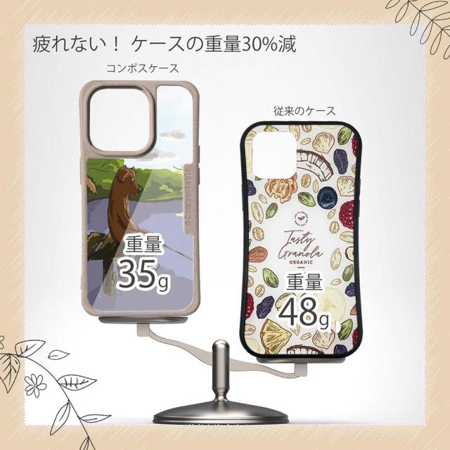 | 注意事項 | コンポスケースは、フレーム部分に「生分解性プラスチック」という環境に優しい素材を使用しております。そのため擦ったり、ぶつけたりする衝撃を与えると脆い部分もあります。耐衝撃ケースではないことをご了承ください。 Qi充電やMagSafe充電にも対応していますが、装着していない時に比べると充電速度は落ちます。 |