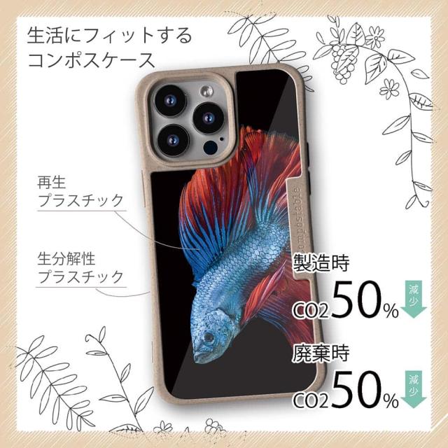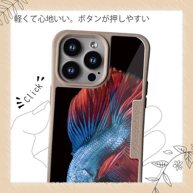 | 注意事項 | コンポスケースは、フレーム部分に「生分解性プラスチック」という環境に優しい素材を使用しております。そのため擦ったり、ぶつけたりする衝撃を与えると脆い部分もあります。耐衝撃ケースではないことをご了承ください。 Qi充電やMagSafe充電にも対応していますが、装着していない時に比べると充電速度は落ちます。 |