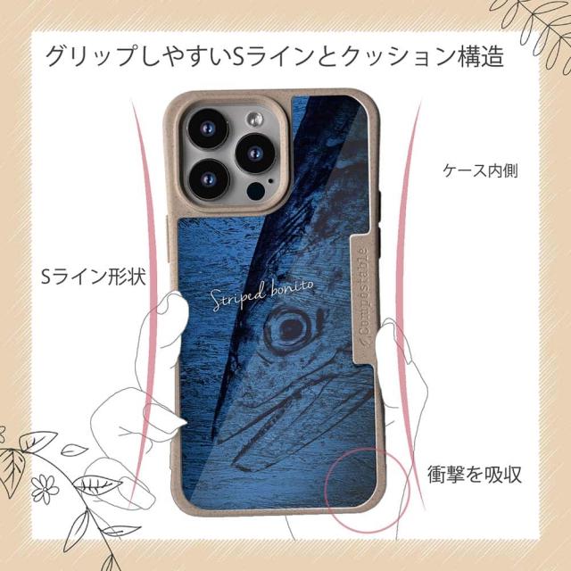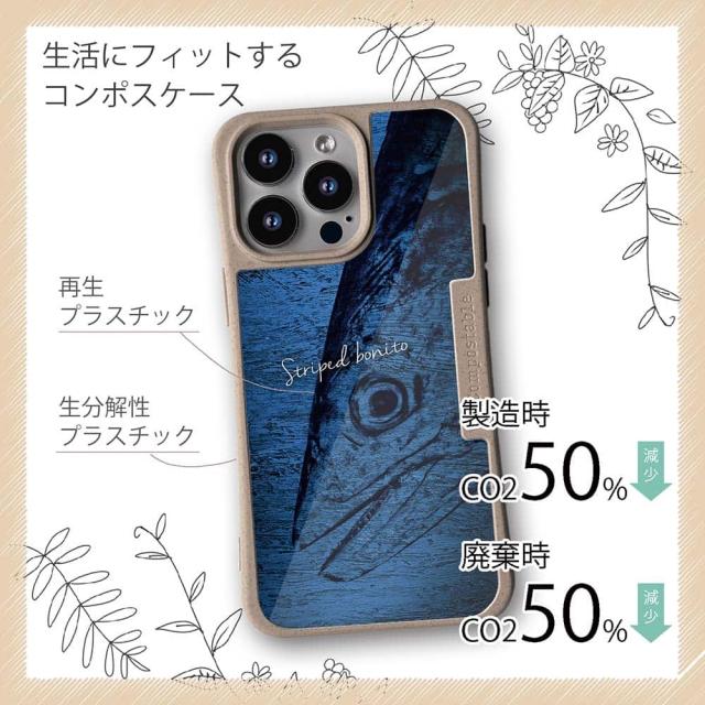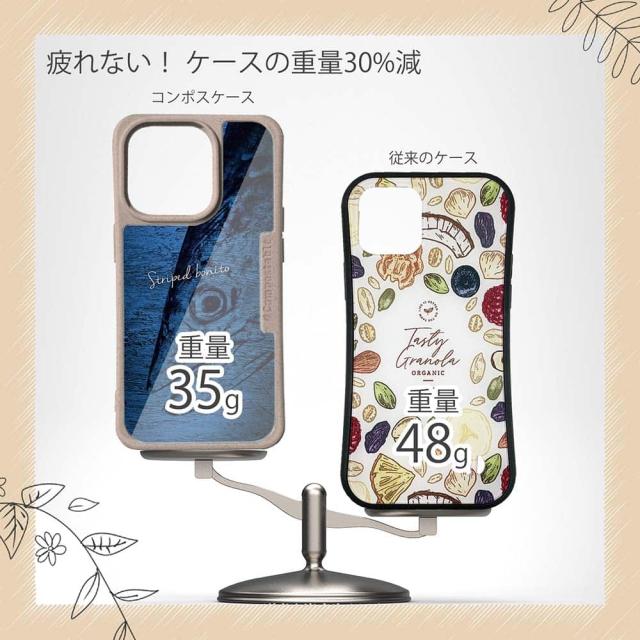 | 注意事項 | コンポスケースは、フレーム部分に「生分解性プラスチック」という環境に優しい素材を使用しております。そのため擦ったり、ぶつけたりする衝撃を与えると脆い部分もあります。耐衝撃ケースではないことをご了承ください。 Qi充電やMagSafe充電にも対応していますが、装着していない時に比べると充電速度は落ちます。 |