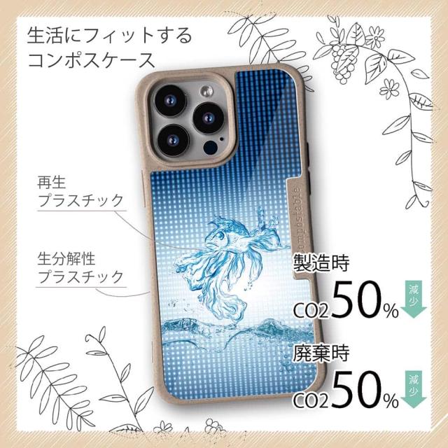 | 注意事項 | コンポスケースは、フレーム部分に「生分解性プラスチック」という環境に優しい素材を使用しております。そのため擦ったり、ぶつけたりする衝撃を与えると脆い部分もあります。耐衝撃ケースではないことをご了承ください。 Qi充電やMagSafe充電にも対応していますが、装着していない時に比べると充電速度は落ちます。 |