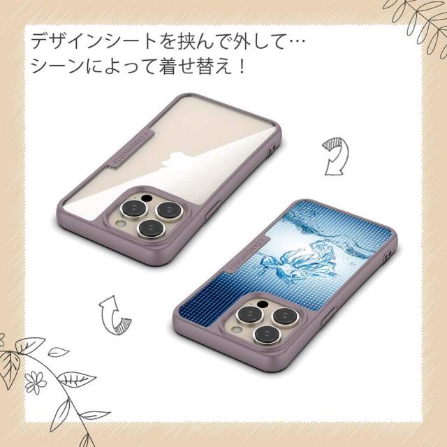 | ケースについて | 背面の内側に入れ込むデザインシートで、シーンに合わせて着せ替え可能。また、グリップしやすいクッション構造で、本体重量は約35gと軽減化を実現。さらにSライン形状で、究極に押しやすいボタン設計(切り込みが入ることで押し込む力を軽減)、背面のカメラ・レンズを保護する高さ設計となっております。生分解性プラスチック素材ながらも着脱もしやすく、割れない・指紋防止加工を施しています。 |