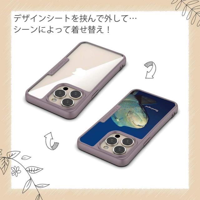 | ケースについて | 背面の内側に入れ込むデザインシートで、シーンに合わせて着せ替え可能。また、グリップしやすいクッション構造で、本体重量は約35gと軽減化を実現。さらに衝撃に強いSライン形状、究極に押しやすいボタン設計(切り込みが入ることで押し込む力を軽減)、背面のカメラ・レンズを保護する高さ設計となっております。生分解性プラスチック素材ながらも着脱もしやすく、割れない・指紋防止加工を施しています。 |
