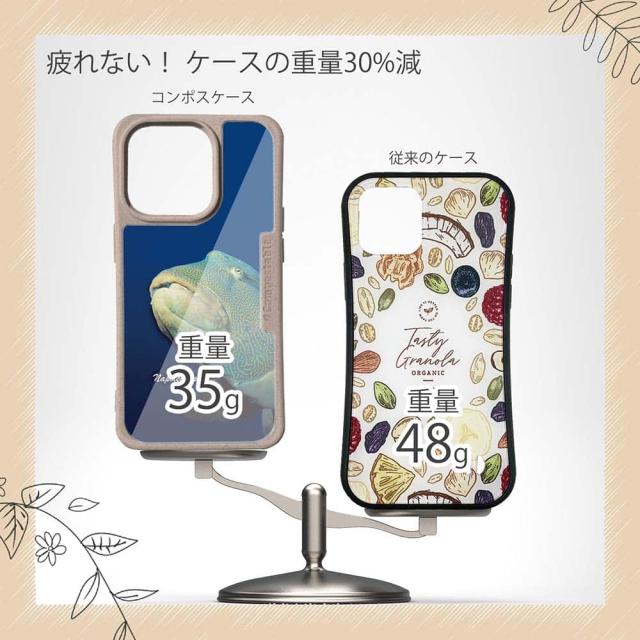 | 注意事項 | コンポスケースは、フレーム部分に「生分解性プラスチック」という環境に優しい素材を使用しております。そのため擦ったり、ぶつけたりする衝撃を与えると脆い部分もあります。耐衝撃ケースではないことをご了承ください。 Qi充電やMagSafe充電にも対応していますが、装着していない時に比べると充電速度は落ちます。 |