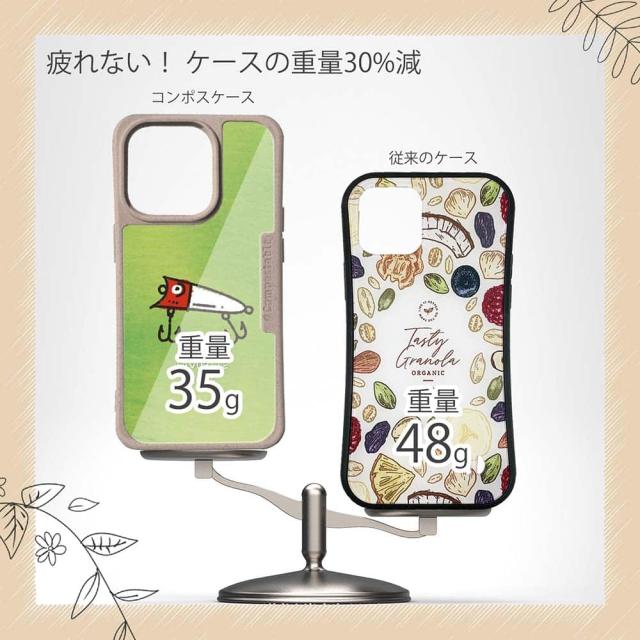 | 注意事項 | コンポスケースは、フレーム部分に「生分解性プラスチック」という環境に優しい素材を使用しております。そのため擦ったり、ぶつけたりする衝撃を与えると脆い部分もあります。耐衝撃ケースではないことをご了承ください。 Qi充電やMagSafe充電にも対応していますが、装着していない時に比べると充電速度は落ちます。 |