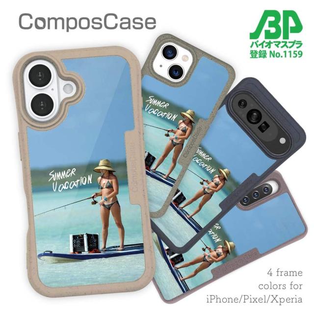 コンポスケース & 着せ替え デザインシート セット Google Pixel9a Pixel9 Pro XL Pixel8a Pixel8 Pro Xperia 10 V ケース 背面 生分解性 4色 釣り 魚 ルアー ビキニフィッシング 釣りガール