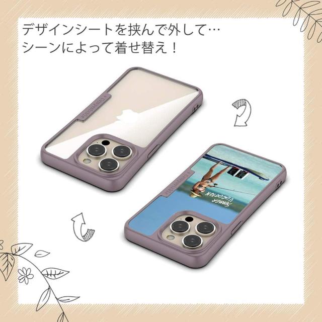 | デザインシートについて | 薄いPET素材にUV印刷を施してプリントします。ケース背面には透明の再生プラスチックが取り付けられているので、その内側にシートを入れ、スマホ本体をハメ込んで使います(背面の再生プラスチックとスマホの間にシートを挟むイメージ)。また、シート自体は着せ替えが可能です(当店にて別途、他のデザインシートを購入可能)。 |