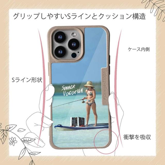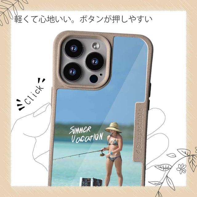 | 注意事項 | コンポスケースは、フレーム部分に「生分解性プラスチック」という環境に優しい素材を使用しております。そのため擦ったり、ぶつけたりする衝撃を与えると脆い部分もあります。耐衝撃ケースではないことをご了承ください。 Qi充電やMagSafe充電にも対応していますが、装着していない時に比べると充電速度は落ちます。 |