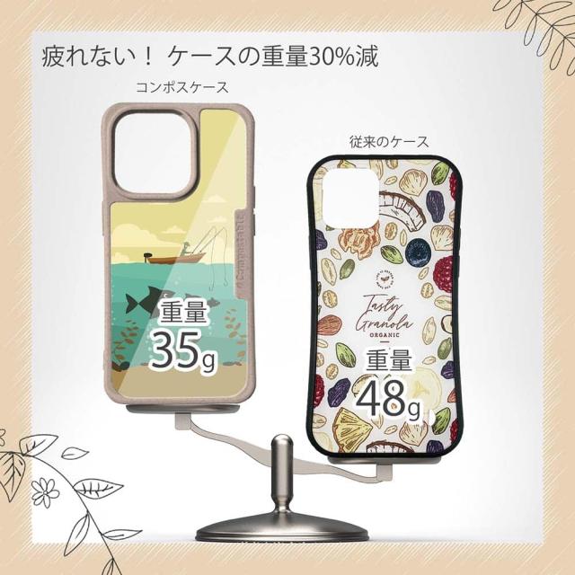 | 注意事項 | コンポスケースは、フレーム部分に「生分解性プラスチック」という環境に優しい素材を使用しております。そのため擦ったり、ぶつけたりする衝撃を与えると脆い部分もあります。耐衝撃ケースではないことをご了承ください。 Qi充電やMagSafe充電にも対応していますが、装着していない時に比べると充電速度は落ちます。 |