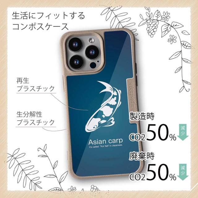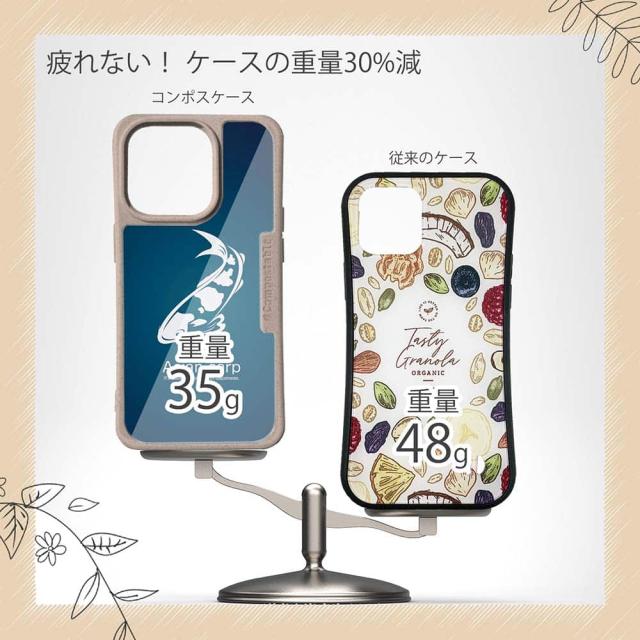 | 注意事項 | コンポスケースは、フレーム部分に「生分解性プラスチック」という環境に優しい素材を使用しております。そのため擦ったり、ぶつけたりする衝撃を与えると脆い部分もあります。耐衝撃ケースではないことをご了承ください。 Qi充電やMagSafe充電にも対応していますが、装着していない時に比べると充電速度は落ちます。 |