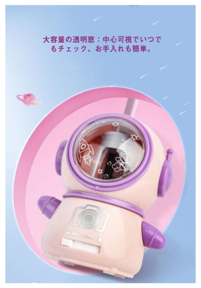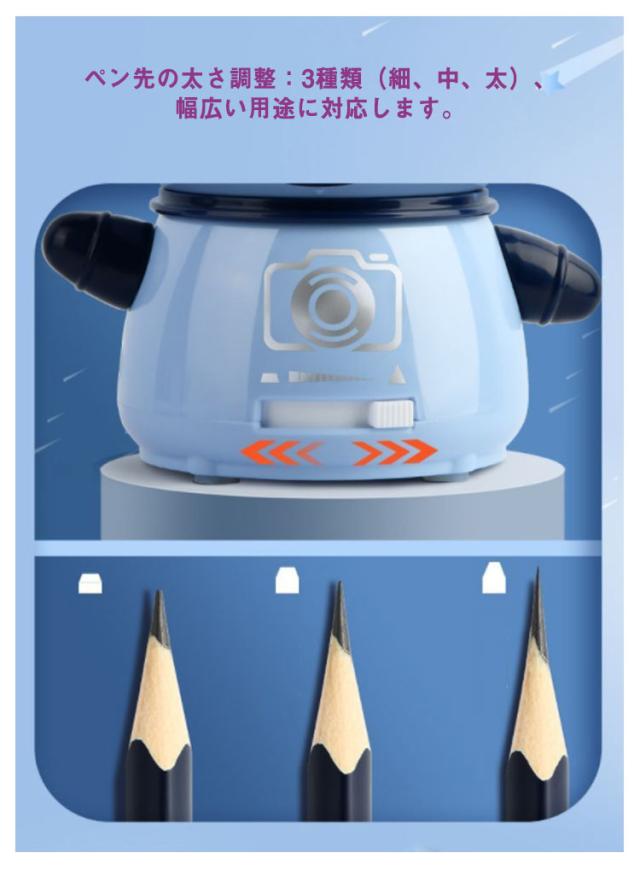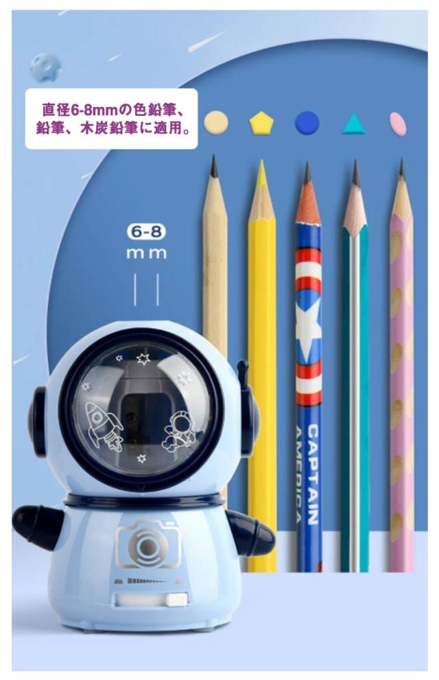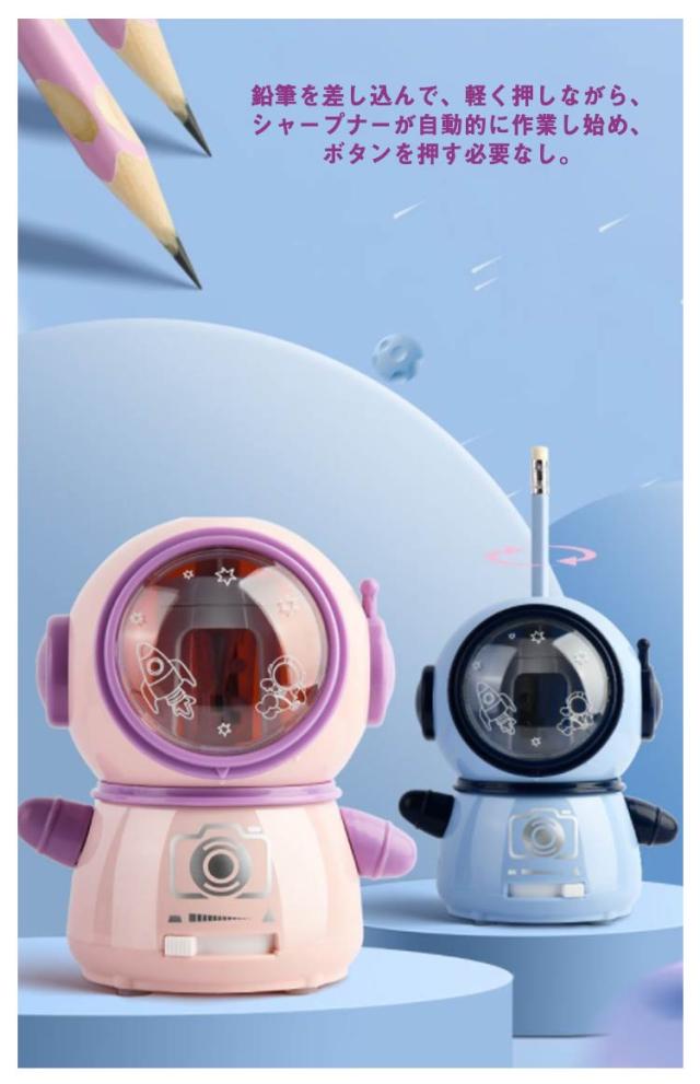| かわいい宇宙飛行士型の電動鉛筆削り。【USB充電式?電池両用】【ペン先の太さ調節可能】 実用性&デザイン性を兼ね備えた鉛筆削りがほしい! 耐久性に優れたスパイラル切削刃を使い、高速回転で削り切れる。3〜5秒以内に鉛筆を完璧に削りあがれます。耐久性、高効率に優れている。直径6-8mmの色鉛筆、鉛筆、木炭鉛筆に適用。 鉛筆を差し込んで、軽く押しながら、シャープナーが自動的に作業し始め、ボタンを押す必要なし。ダストボックスを外すと作動しない安全仕様で、手に傷つけない安全性が保障できて、子供でも安全的に操作可能。 ペン先の太さ調整:3種類(細、中、太)、幅広い用途に対応します。 大容量の透明窓:中心可視でいつでもチェック、お手入れも簡単。 | |