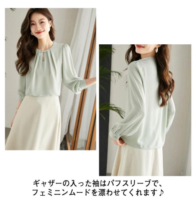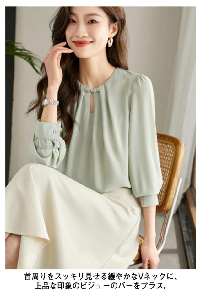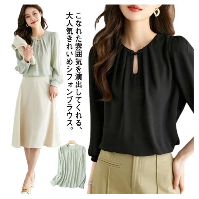送料無料 シフォンブラウス レディース シャツブラウス 長袖 シフォンシャツ ノーカラー スーツ インナー プルオーバー シンプル 無地 とろみシャツ シフォン きれいめ オフィス 通勤 エレガント 大人 かわいい おしゃれ