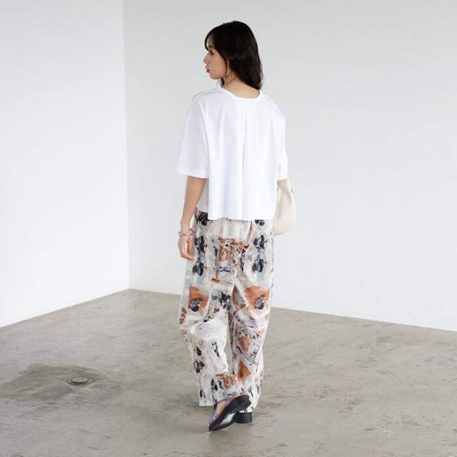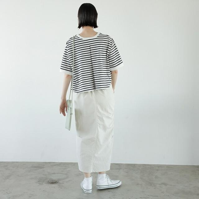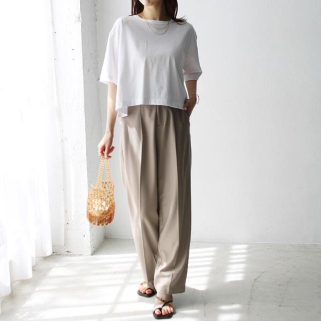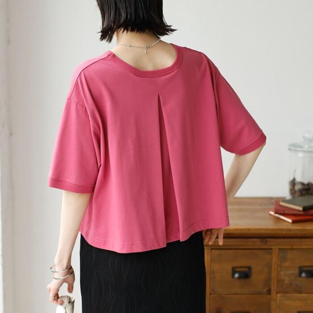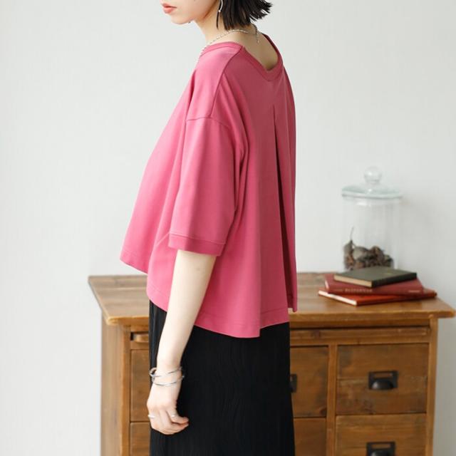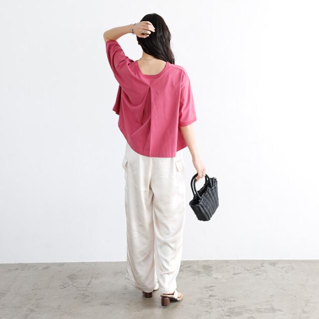 バックのタックデザインもポイントで、シンプルなのに後ろ姿は目を引く一枚。