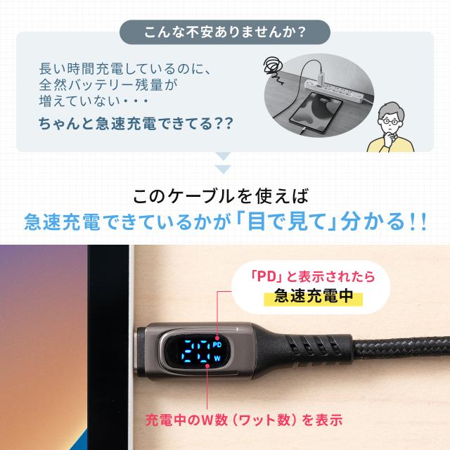 PD電力表示機能付き USB Type-Cケーブル PD100W対応 e-marker搭載 USB2.0 1m 高耐久 ポリエチレンメッシュケーブル 充電 データ転送 スマホ タブレット ブラック[500-USB076]