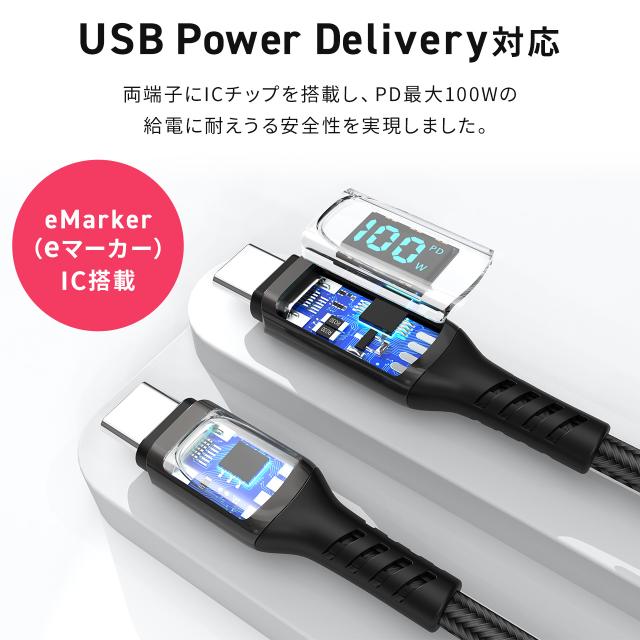 ⇒ご購入の前にご確認下さいPD電力表示機能が付いたUSB Type-Cケーブル。PD100W対応なので電源ケーブルに最適。高密度ポリエチレンメッシュケーブルを採用し耐久性に優れています。1m。ブラック。【WEB限定商品】