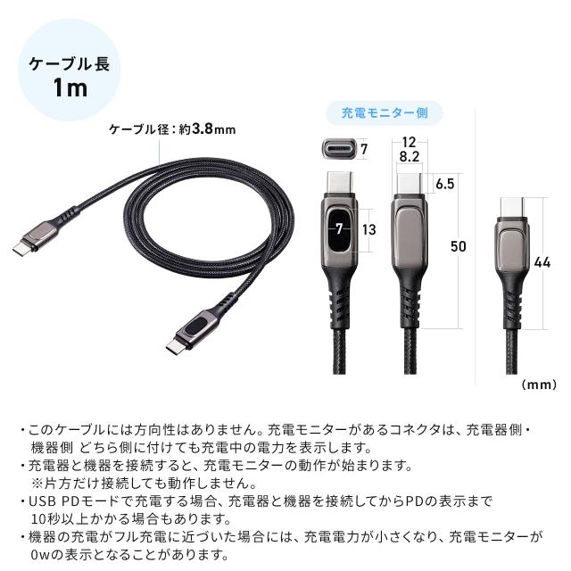 ※このケーブルには方向性はありません。充電モニターがあるコネクタは、充電器側・機器側のどちら側に付けても充電中の電力を表示します。