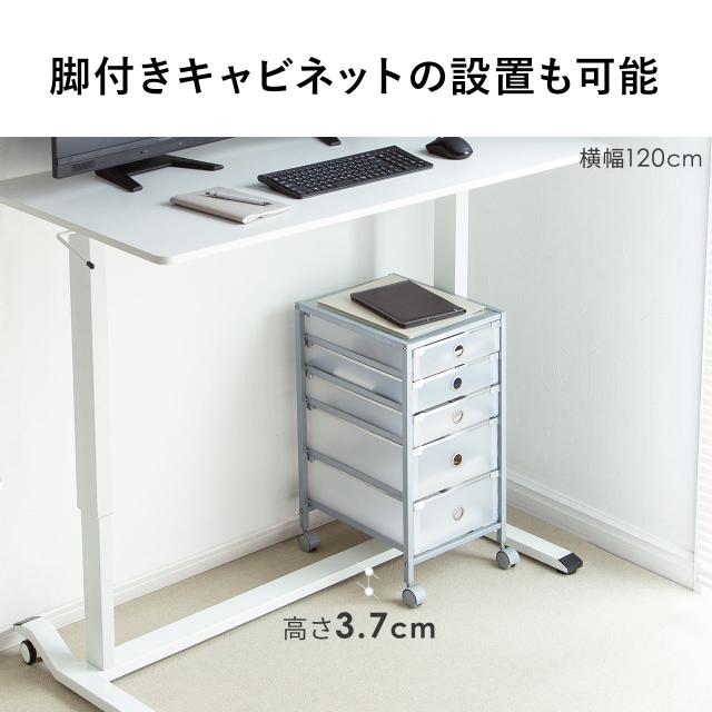 ●前方のフレームはアジャスタを装備。またフレームは床面からの高さも低くしているので、キャビネットやワゴンなどをフレームをまたいで設置することができます。
