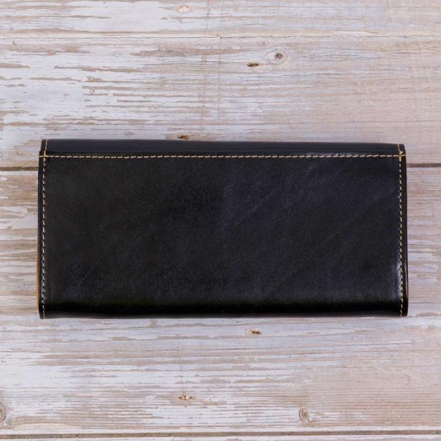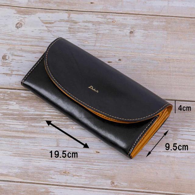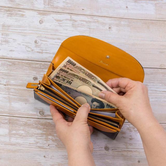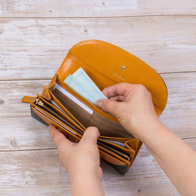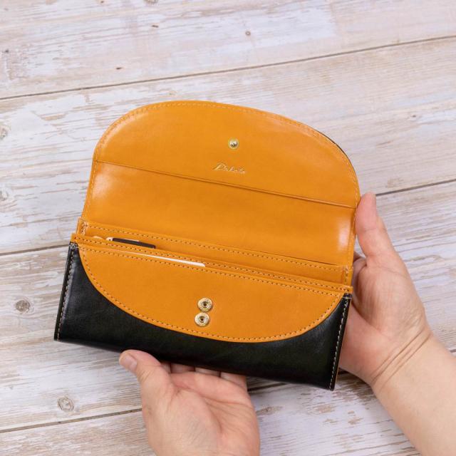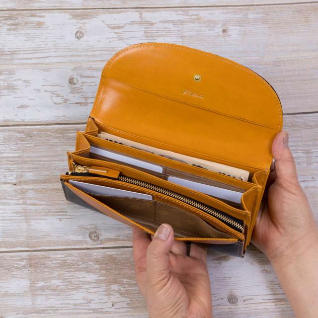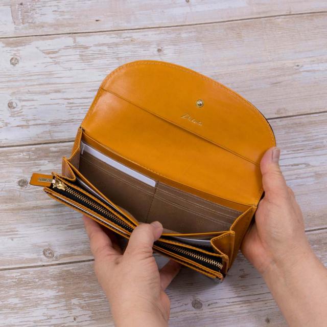 丸みのあるフラップが印象的な長財布です。お札入れスペースは、2箇所備わっており、小銭入れは、中が2つに仕切られています。背面ポケットは、中にカードが2枚収納できるので、すぐに取り出したいカードを入れておくのにも便利です。