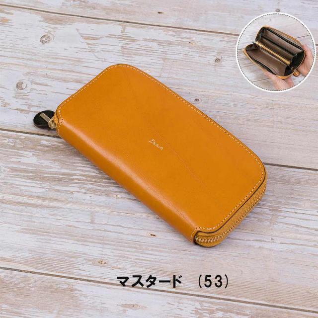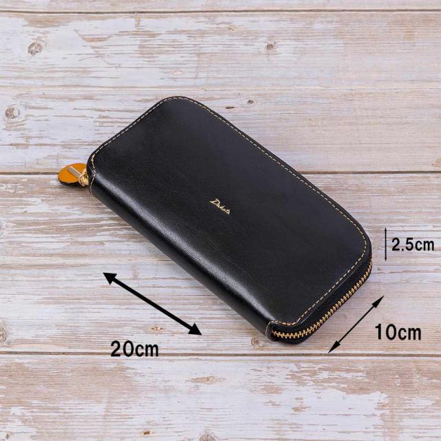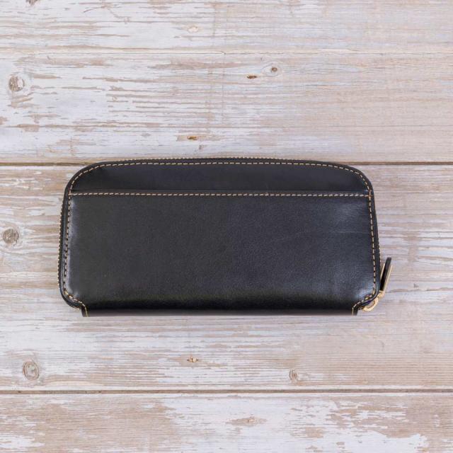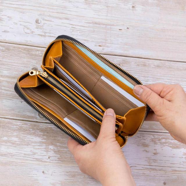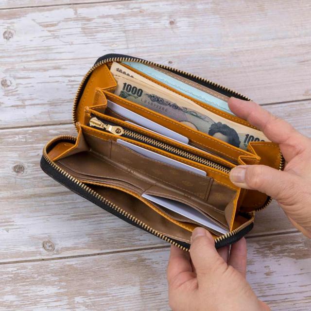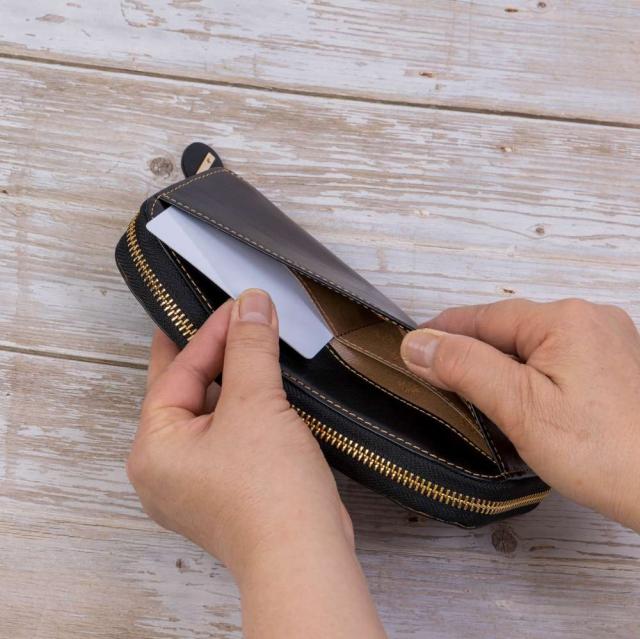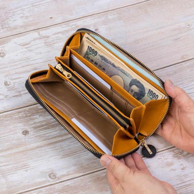 丸みを持たせたフォルムと、丸い引手が魅力のラウンドファスナー長財布です。お札入れスペースは、3箇所備わっており、カードは合計19枚入れることができるので、しっかりとした収納力があります。背面にはカードが2枚収納できるオープンポケットが付いています。