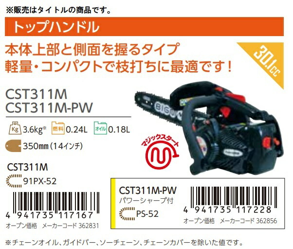 丸山製作所 エンジンチェンソー CST311M 362831 トップハンドル 排気量30.1cc 本体重量約3.6kg ソーチェーン:91PX-52 ビッグエム 在庫