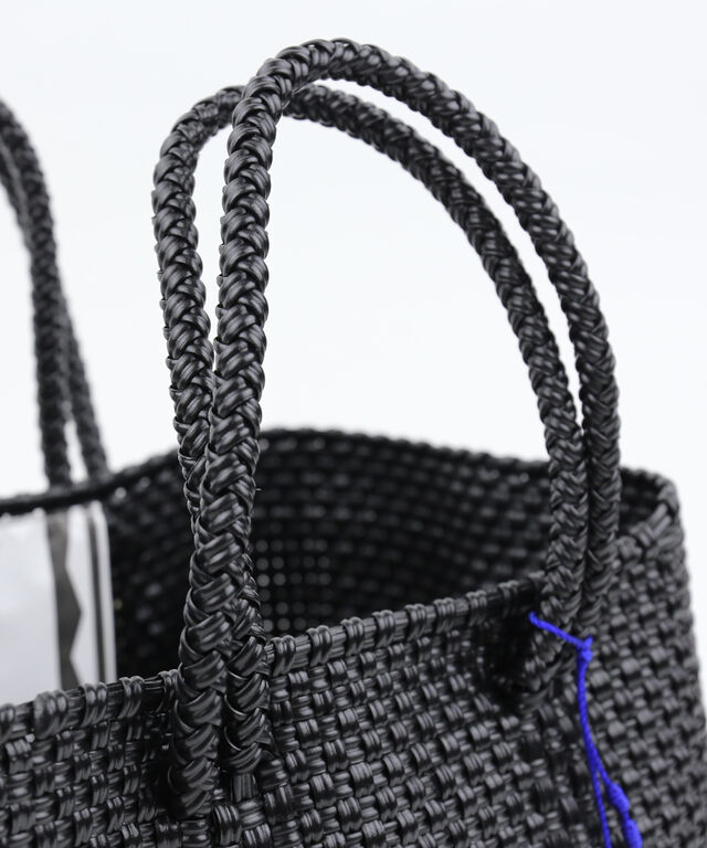 プラスチックを編み込んだハンドメイドのかごバッグで、