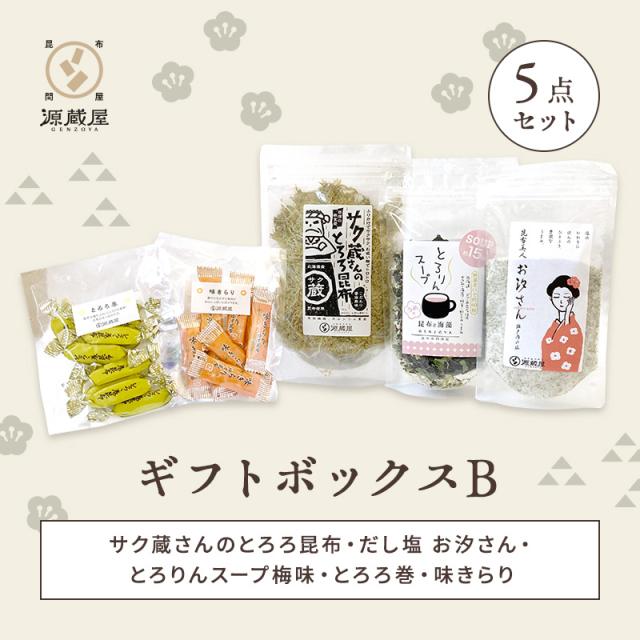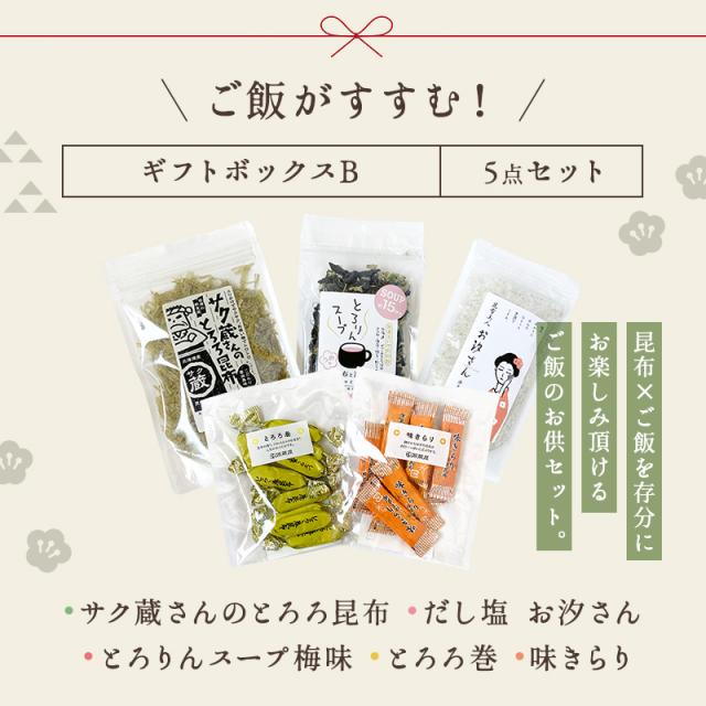 昆布ギフトボックスB 5点セット (サク蔵さんのとろろ昆布・だし塩 お汐さん・とろりんスープ梅味・とろろ巻・味きらり) 送料無料 メッセージカード対応