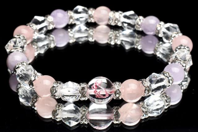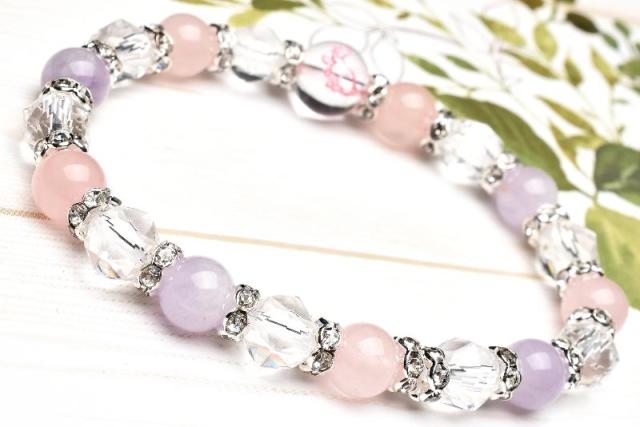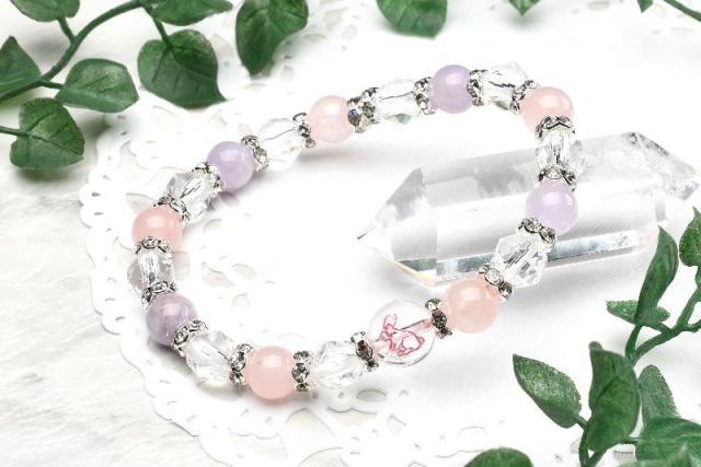 | 特徴・意味 | どちらもミルキーで可愛らしい印象のマダガスカル産ローズクォーツとラベンダーアメジストを組み合わせ、女性らしい印象のブレスに仕上げました。 スターカット水晶とロンデルがキラキラと輝き、お手元を美しく着飾ってくれるでしょう。 この組み合わせは恋愛成就・目標達成などのお守りにおすすめです。 水晶に彫刻された兎は、跳びはねる=飛躍、子沢山=豊穣・子孫繁栄の象徴とされ、 特有の長い耳は福を集めるといわれています。 他にも古くから東洋では「春の象徴」とされ、優しく、穏やかな姿は家内安泰と平和を意味しています。 材質 ▼ 水晶 ピンク彫:10mm 水晶スターカット AA:8mm マダガスカル産ローズクォーツ:8mm ラベンダーアメジスト:8mm 銀ロンデル(クリアー):6mm パワーストーンの中でも、女性から絶大な支持を得ているローズクォーツ。 誰から見ても「かわいい」「美しい」と感じられる石ではないでしょうか。 ローズクォーツは、クォーツ(石英)の変種でピンク色のものをいい、その美しいピンク色やローズ色から、和名を『紅石英』または『バラ石英』と呼ばれています。 同じく淡い色合いで女性に人気のあるラベンダーアメジストも同じクォーツ(石英)の変種です。 どちらも恋愛運に特化した運気を持つパワーストーンのため、縁結びや恋愛成就を含めて、恋に特化した組み合わせだと言えます。 恋人との円満な生活や、幸せな結婚に向けてのお守りにピッタリです。 |